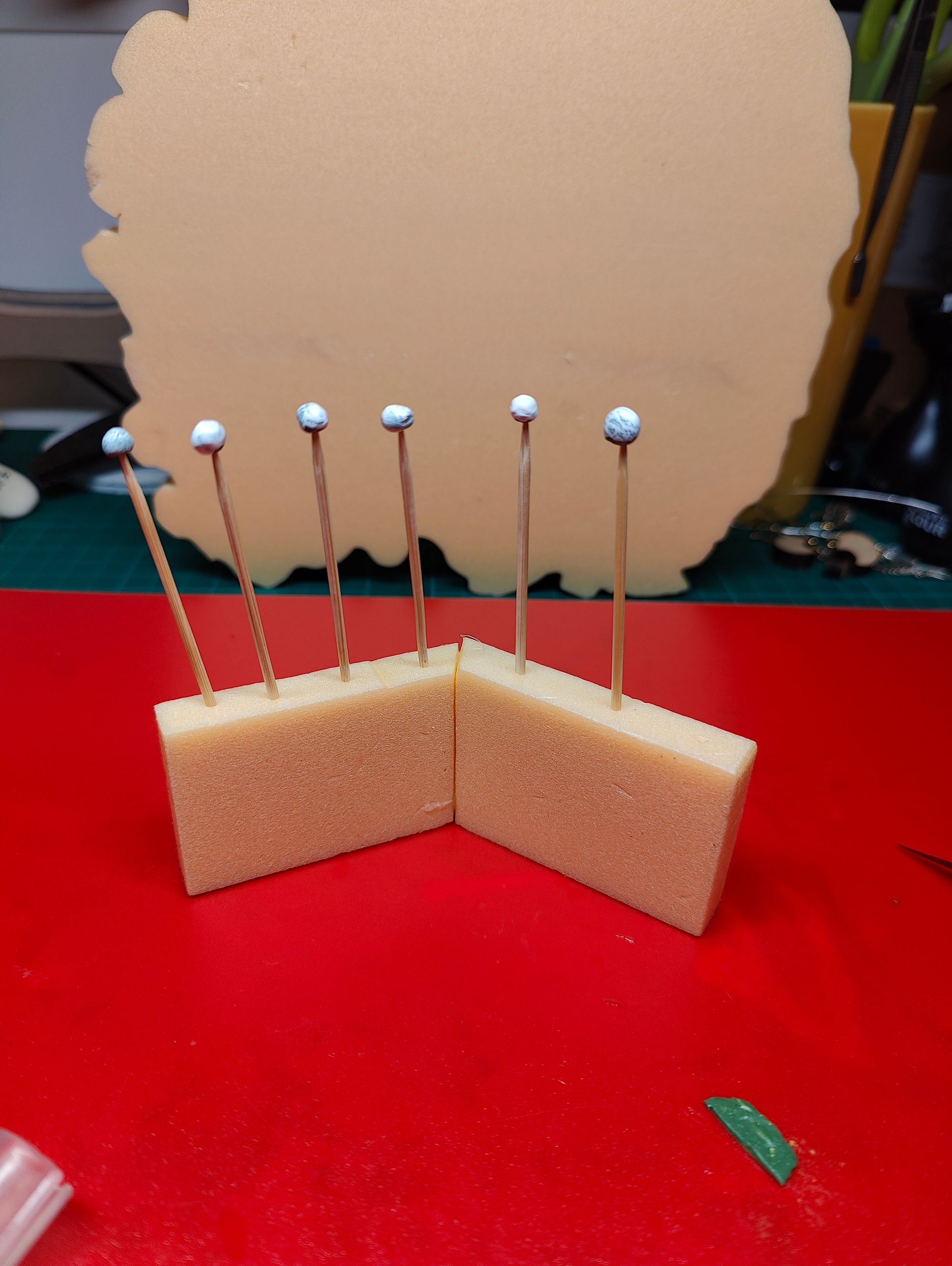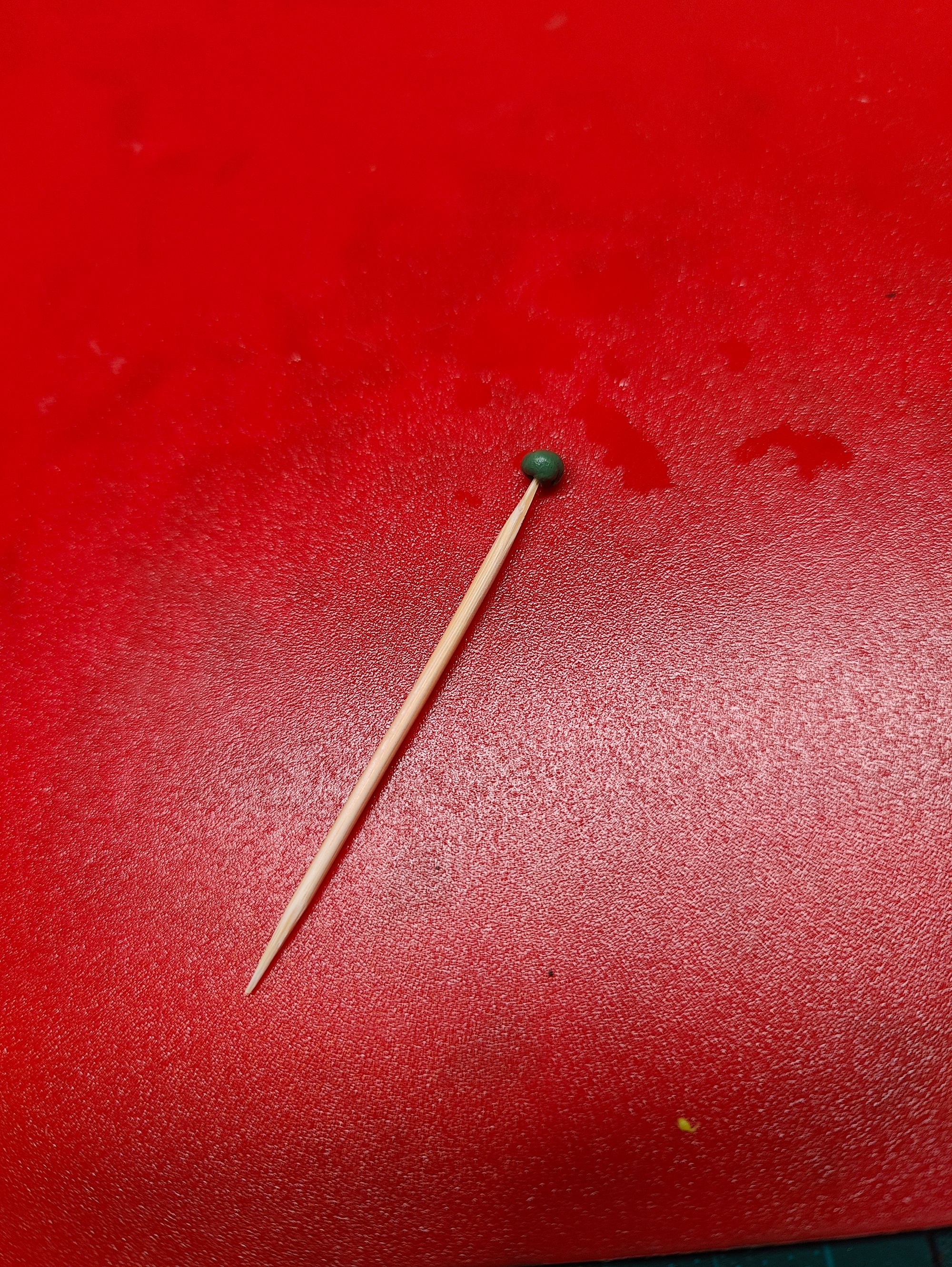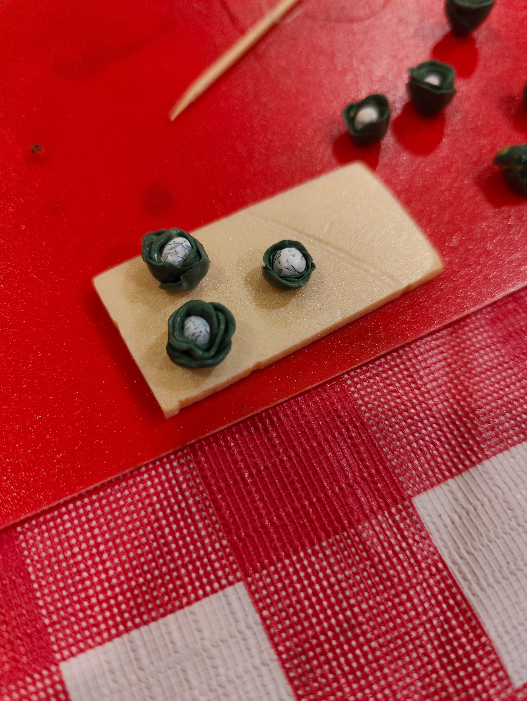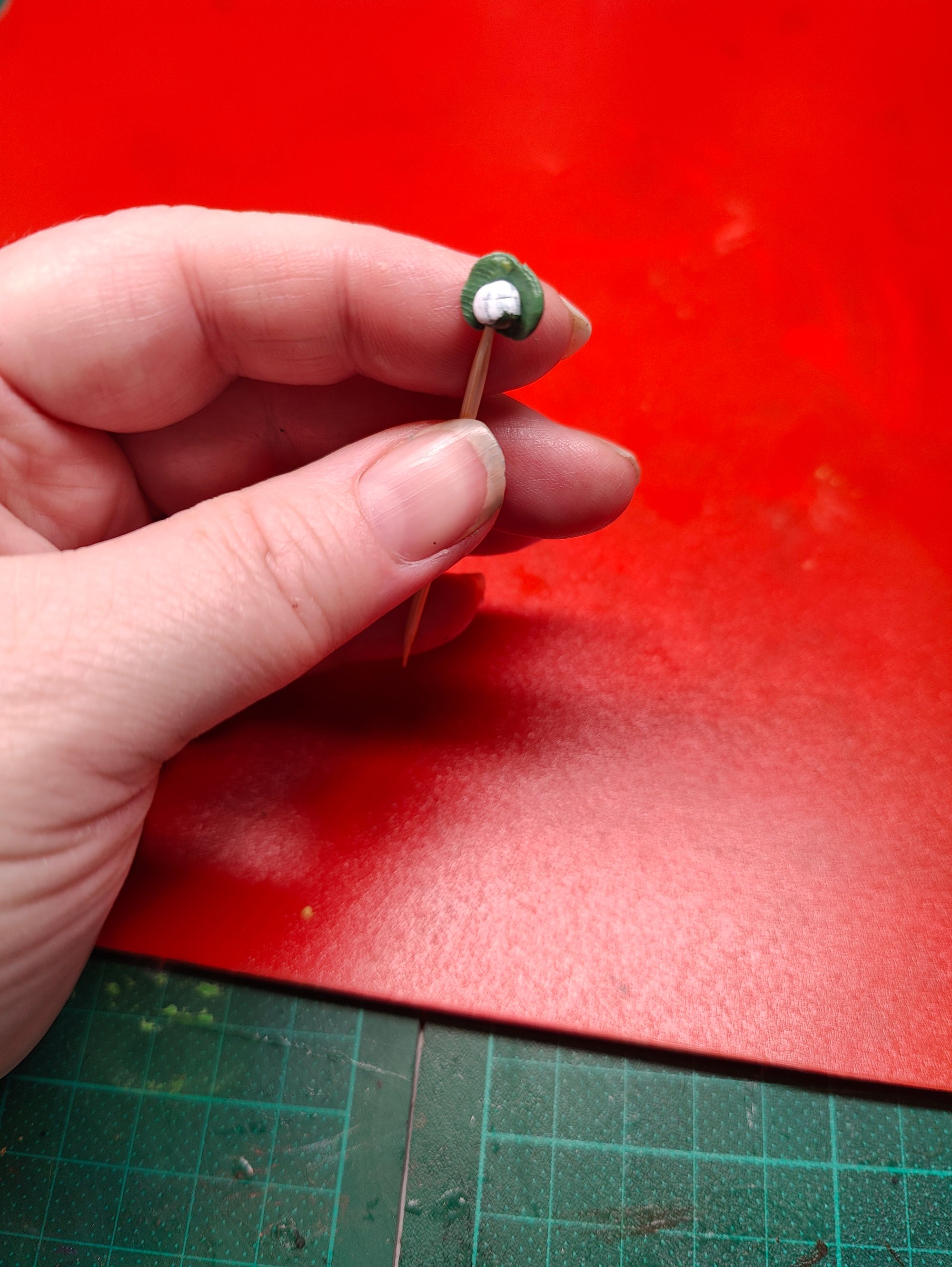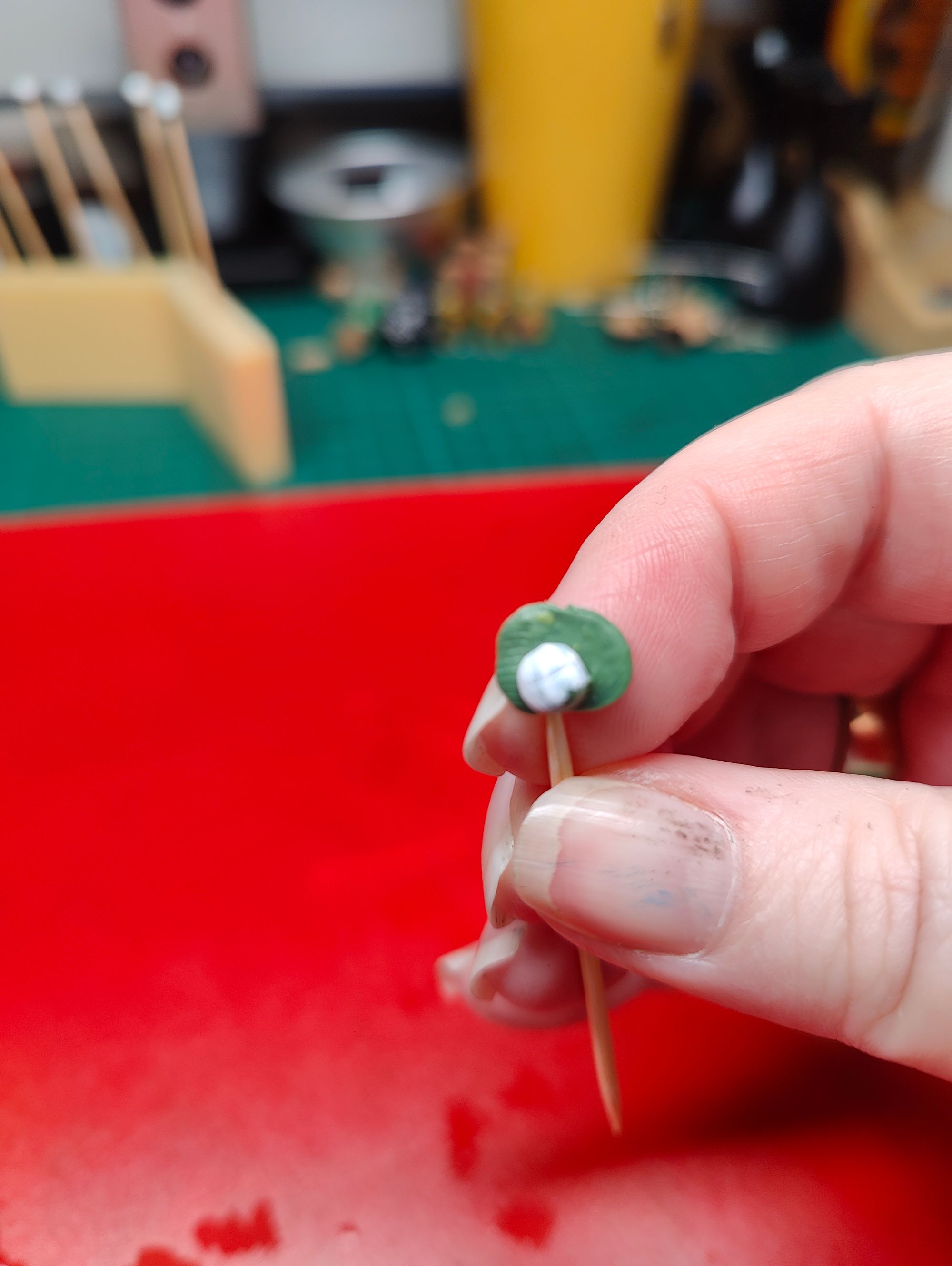 Cabbages and cauliflower lend themselves to easily being made with this sort of medium. I started by rolling tiny balls and sticking them on the end of cocktail sticks to paint them white for the cauliflowers and just rolling them for the cabbage. Next I rolled several more small balls, squashed them with my thumb, kind of smearing the ball on the mat and layering each one around the centres then gently peeling them back slightly. One the green stuff was dry (24 hrs) I added a bit of green shading and highlighting.