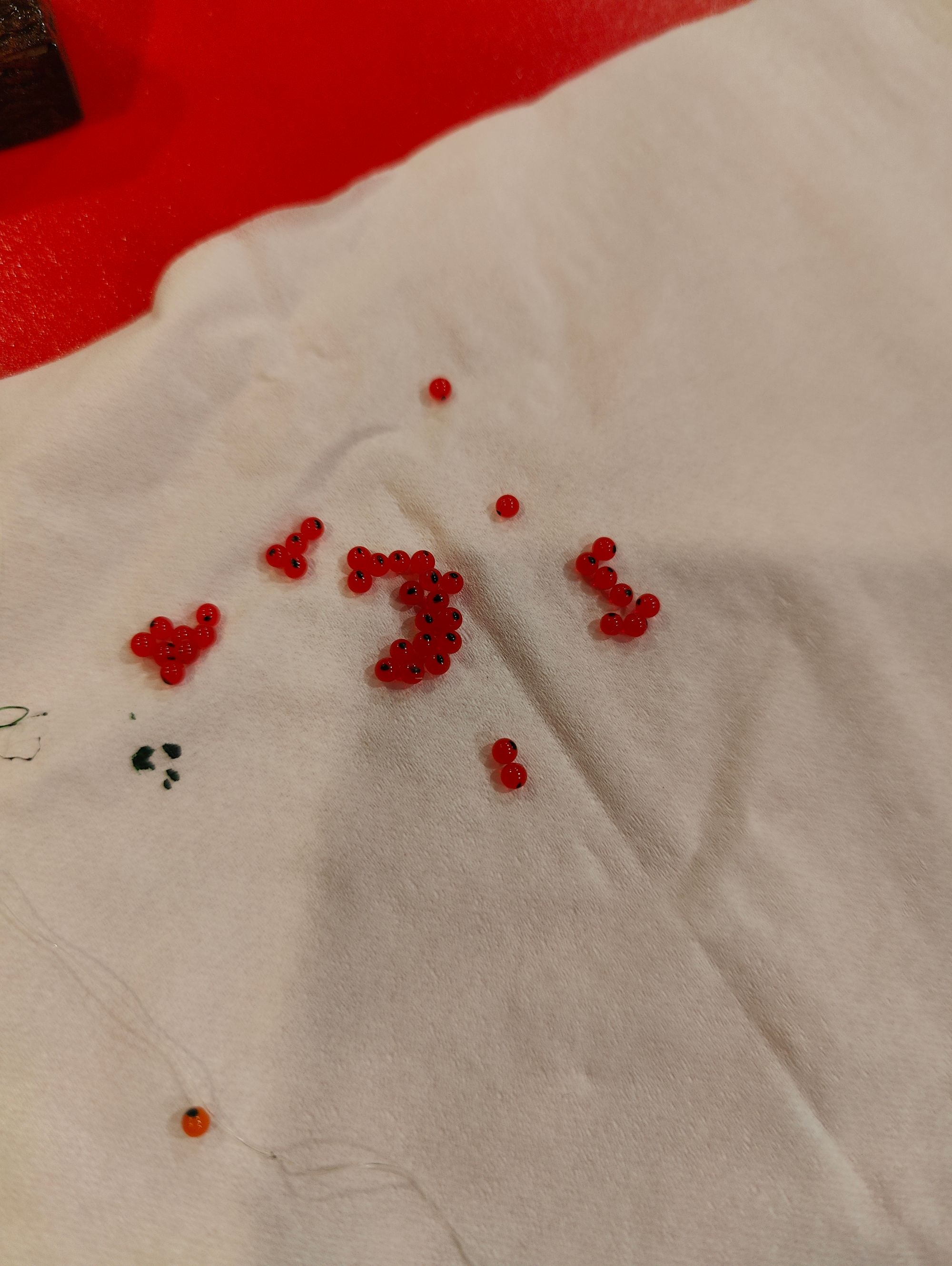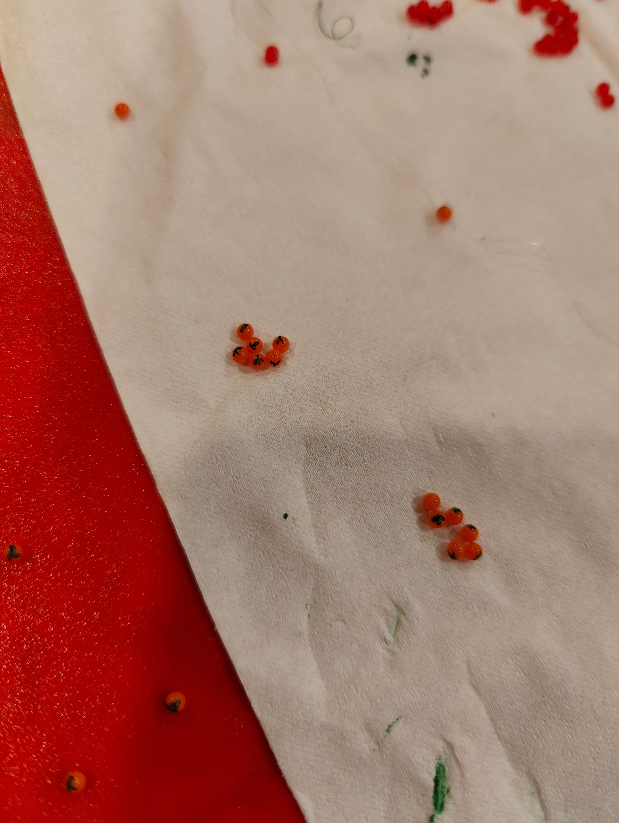 I found some tiny beads that were orange and red, painting tiny leaves on the top of each one, I quickly had some tomatoes and persimmon.