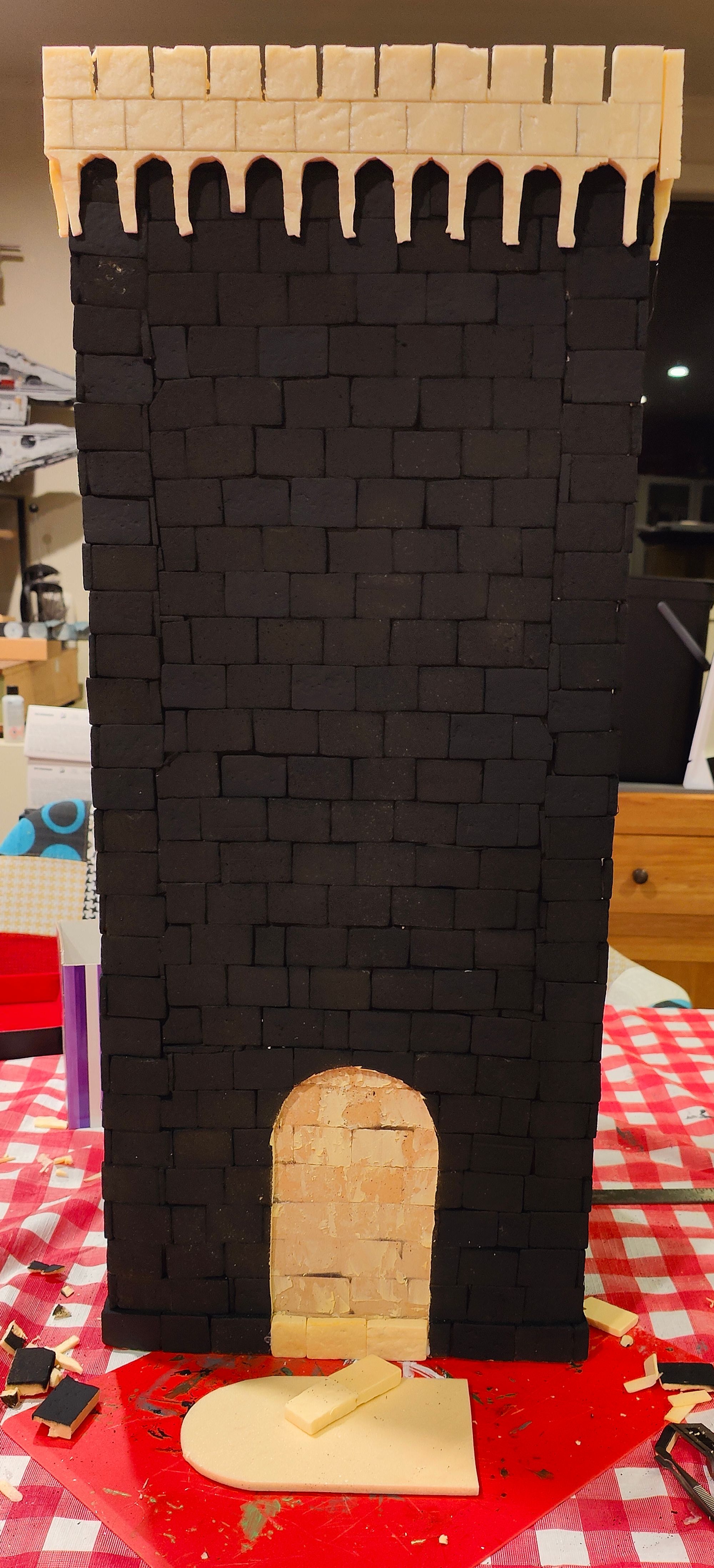 Because I had decided to do this rather late I then had the issue of drawing around the door on the wall and hacking out the bricks from the shape so that I could recess the door. I used two of the thicker bricks to form a step in front of the door. Initially I had thought I wasn't going to bother, same as the arrow slits but as time went on I really felt that a tower would at least have an entrance. Also if there was no door there was no option for the happy couple to remove the door and use the tower as a cat playpen after the big day 😁.