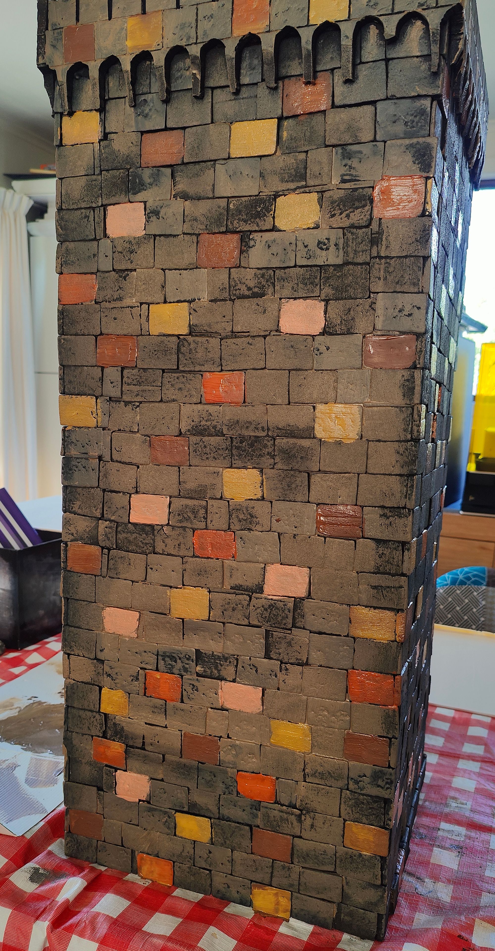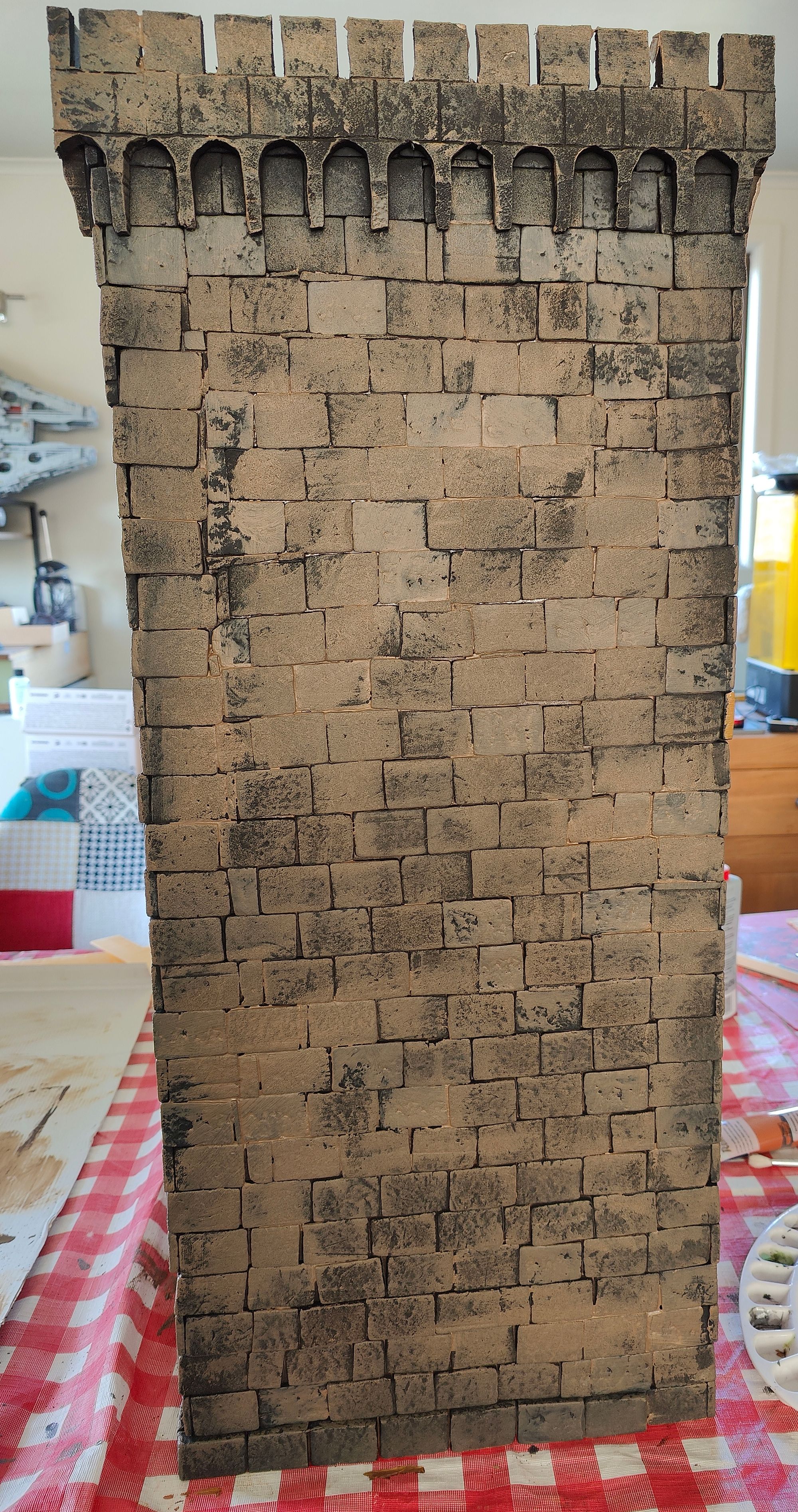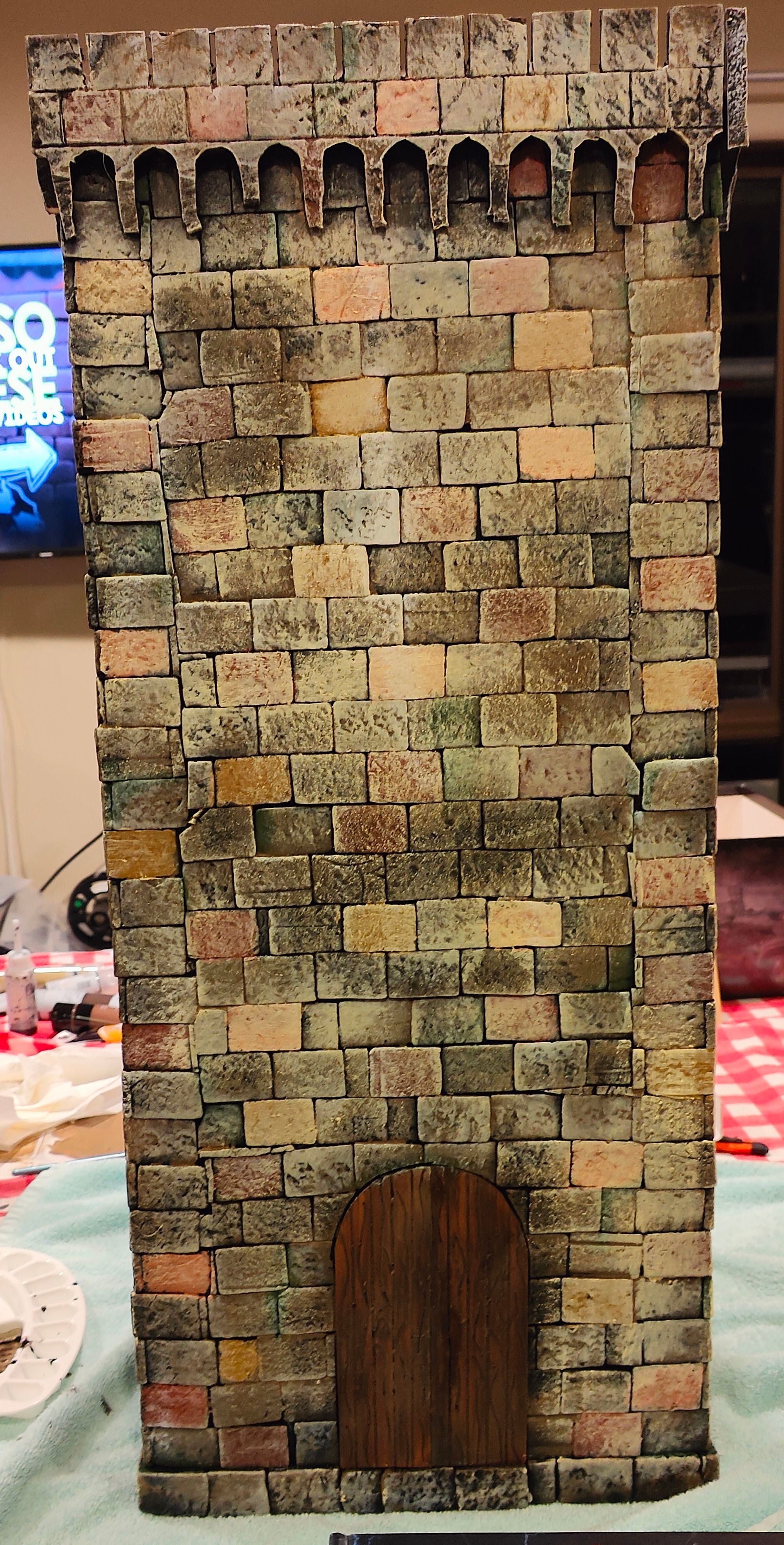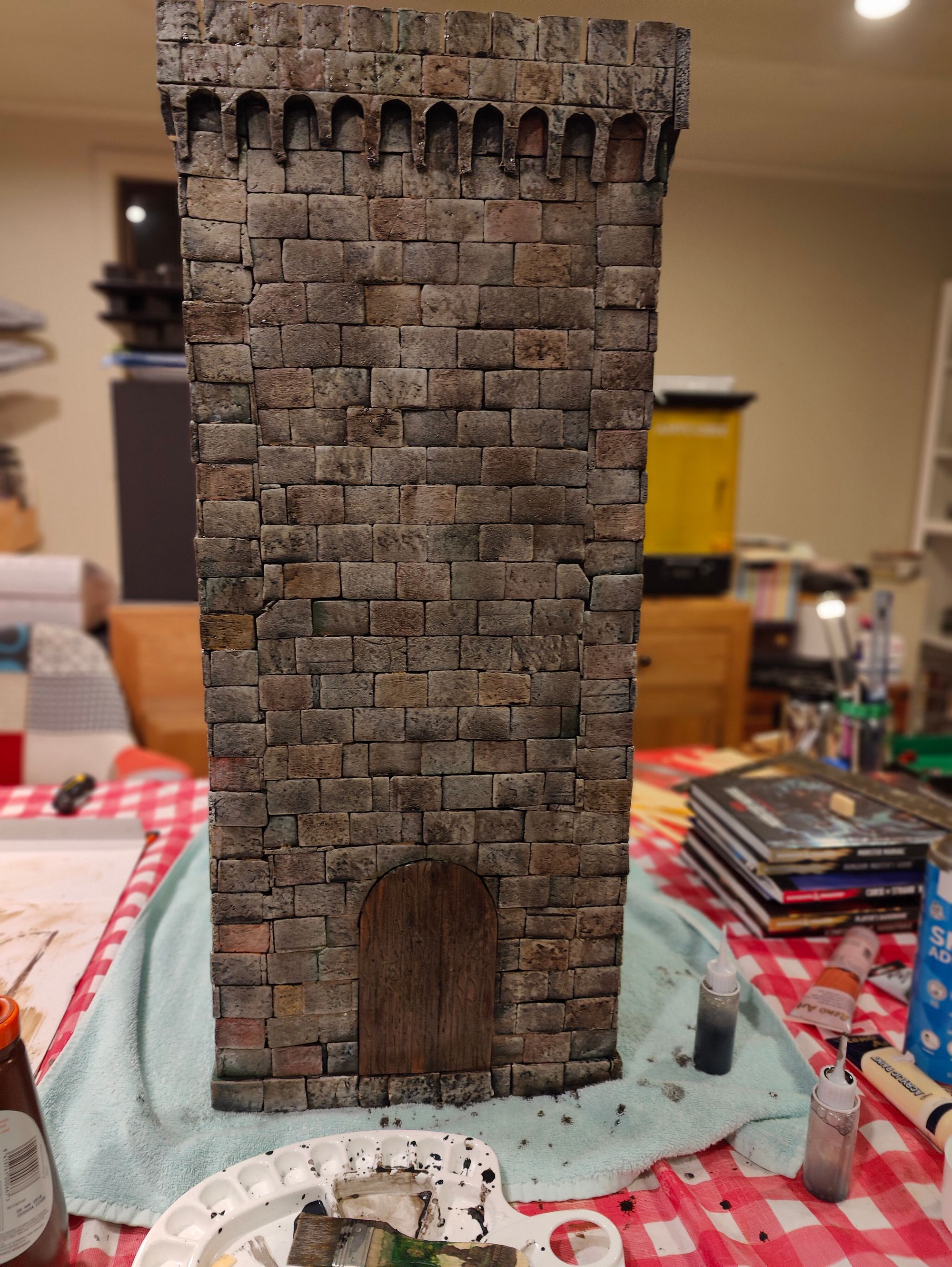 What would I have done differently? I would have started earlier - easy to say. I would have also cut some arrow slits which in turn would have required the inside walls to be base coated in black. I don’t think on something this big the type of wash made any difference so I would keep the acrylic wash. I definitely would have cut the door and arrow slits at the beginning and likely would have put some keystones to define the doorway. At the moss stage where I added dark green Vallejo to the corners of some of the bricks, I would be much heavier handed when I next use this.