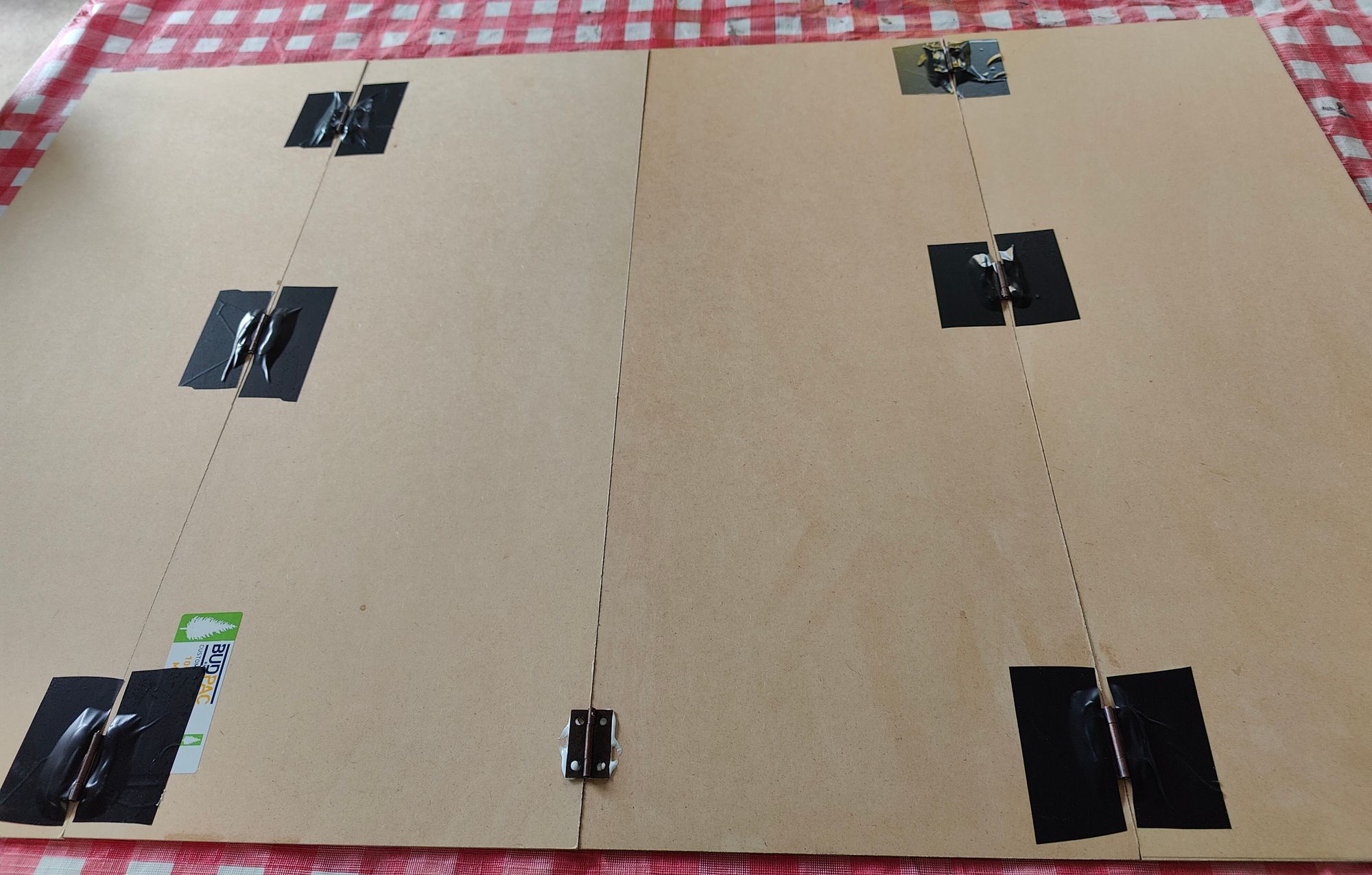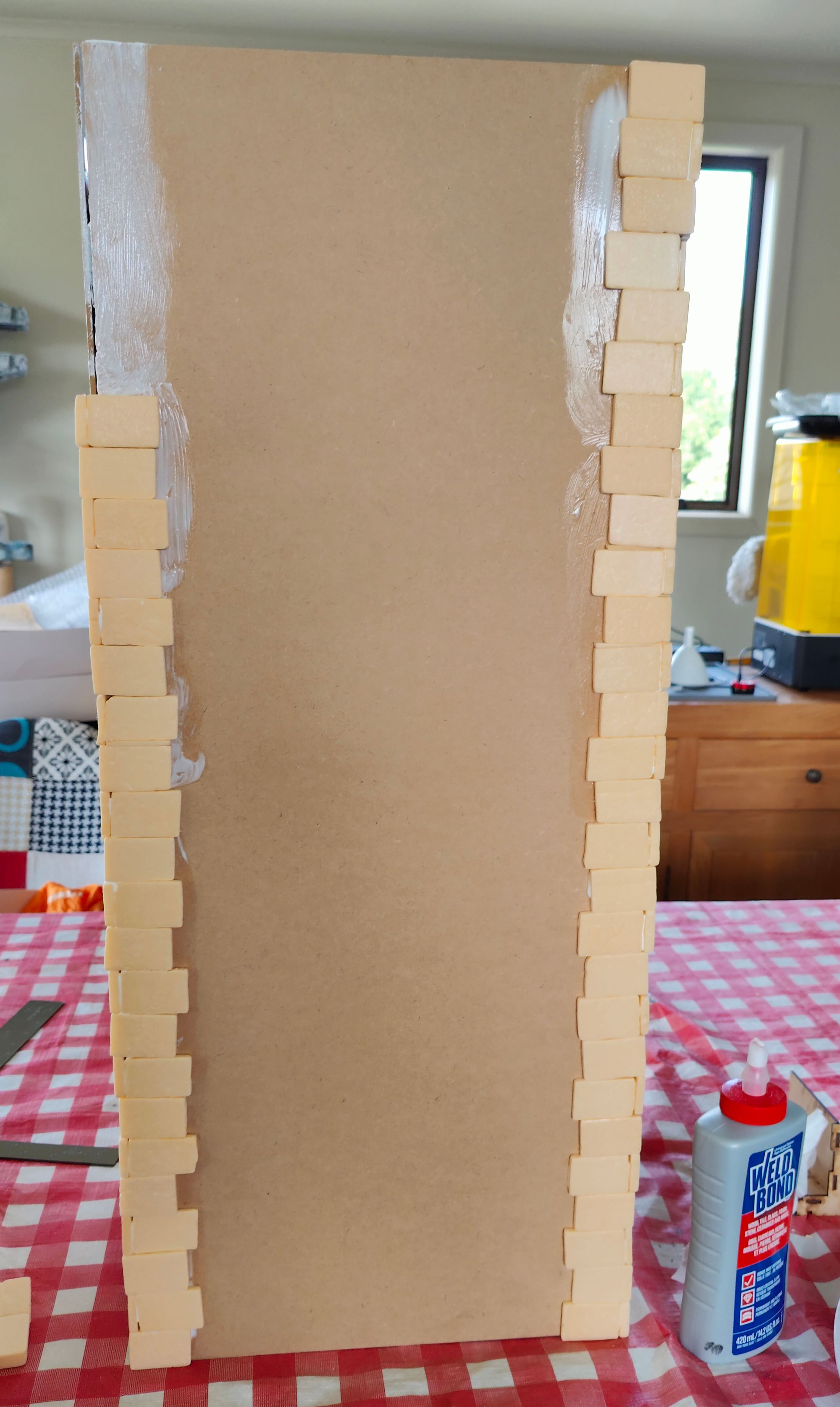 I started by cutting MDF walls and creating the base structure. This model was a lot bigger than I was used to creating so I decided to join the walls with tiny hinges that were glued on with wood glue, a layer of hot glue and topped with a layer of Gorilla tape for support. Angle guides were used to get the 90 degree angles at the corner, but with a four sided tower I doubt this was really necessary.