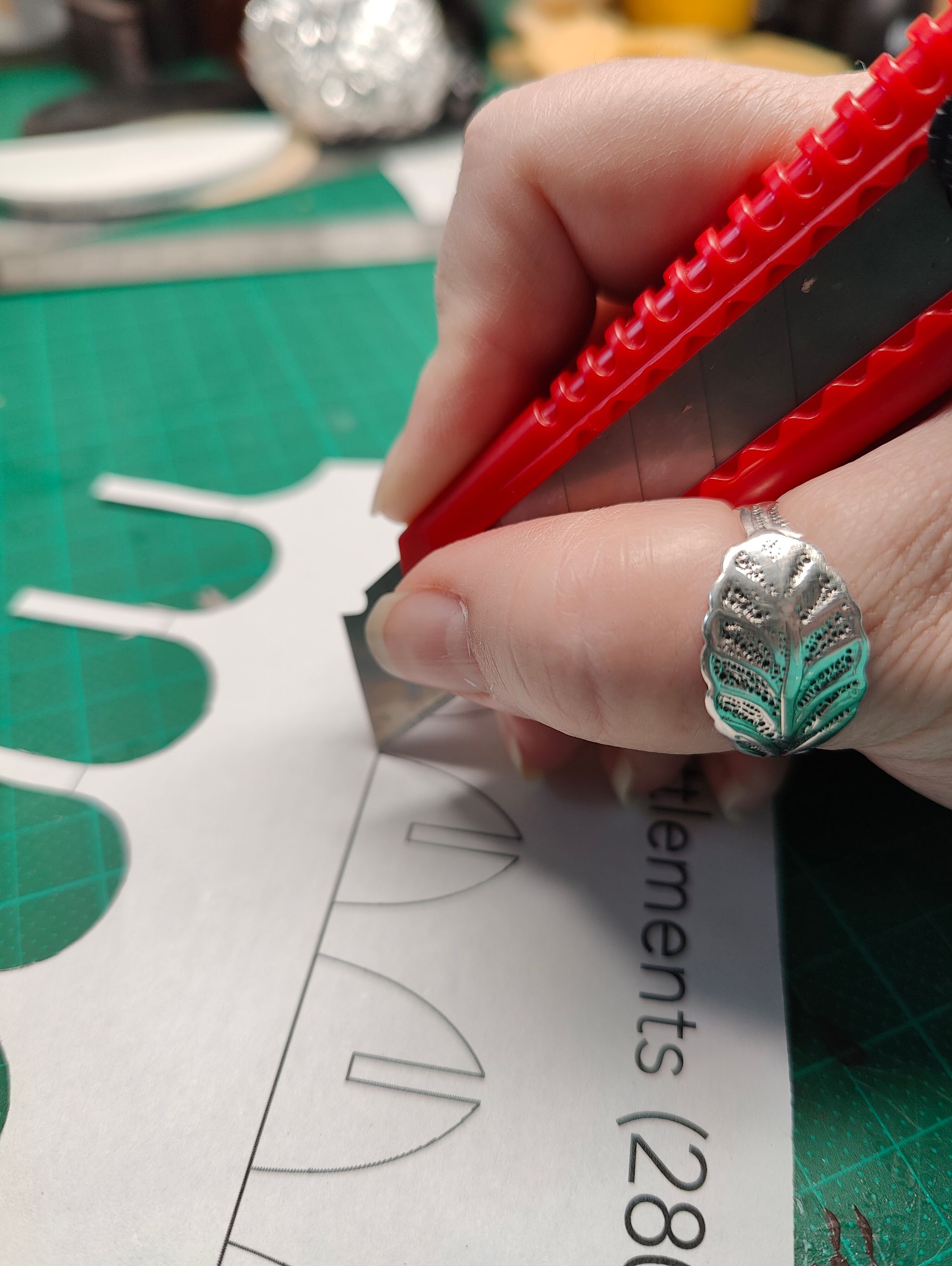 Once the edges were done I used more white glue to laboriously stick the rest of the stonework to the walls, using thicker bricks at the bottom and covering to the top. Again back to ZorpaZorp to get the battlements template which I cannibalised to have straight blocks at the top rather than the mitred version Lochie made. I cut out the guide, changed the shape to what I wanted, drew it onto cardboard, increased to the length needed and cut out two templates, one for top and bottom. Using dressmaking pins to line them up either side of a piece of XPS and tacking them in place with white tack. For speed the Proxxon came out again to cut out the battlements. I angled the corbels with a knife and overall the effect was what I had hoped. Again I glued with white glue and left to dry, using some foam safe spray paint I base coated in black.