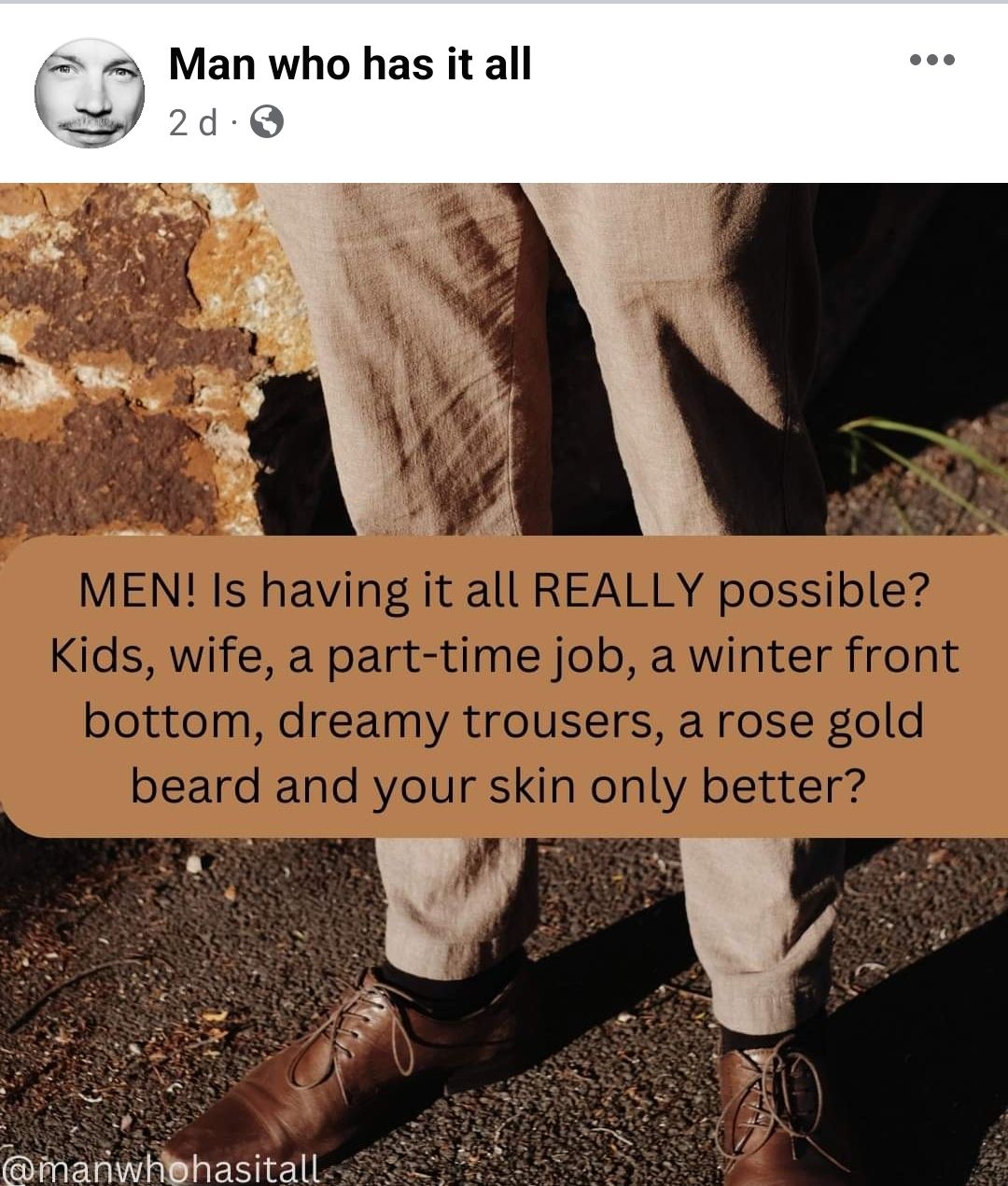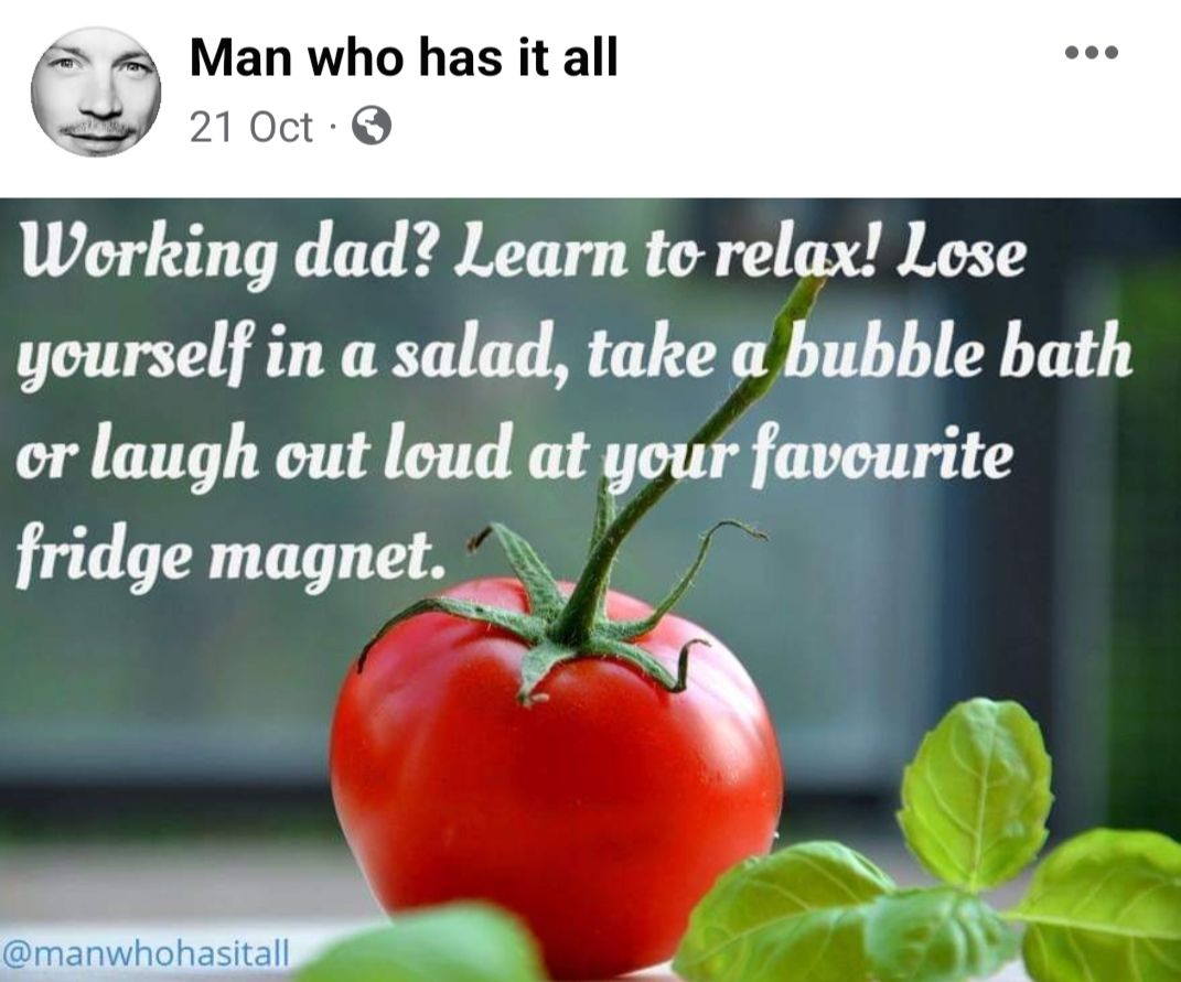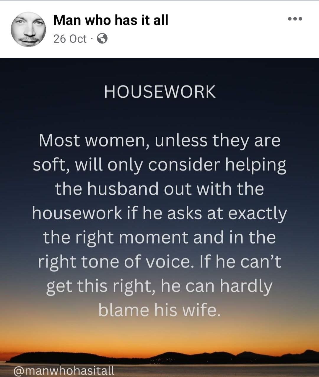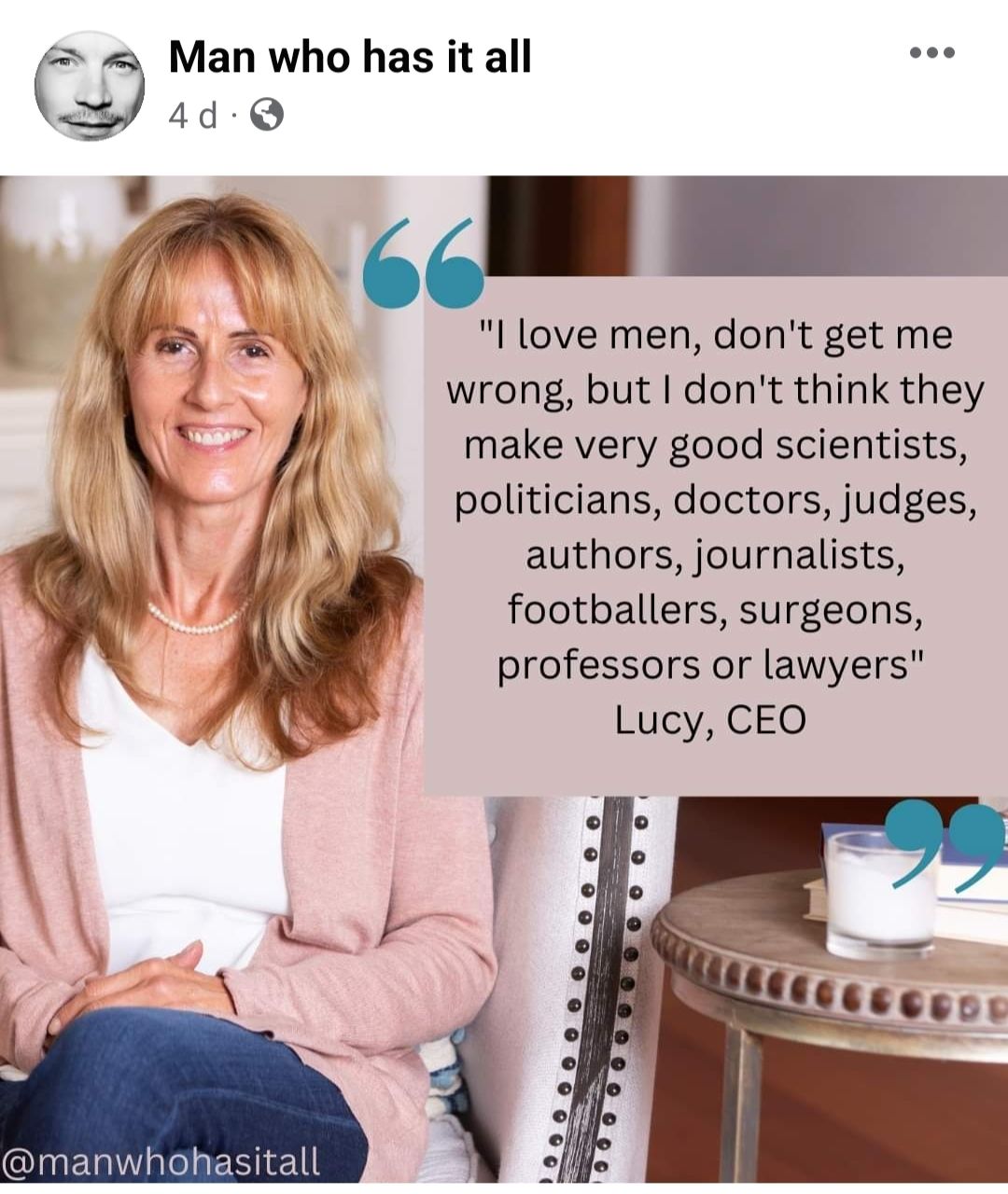 I follow ‘Man who has it all’ on facebook. For those of you who don’t know him, he takes things that have been posted on social media or written by other people, about women, and changes the noun from female to male. He reverses sexism in writing.