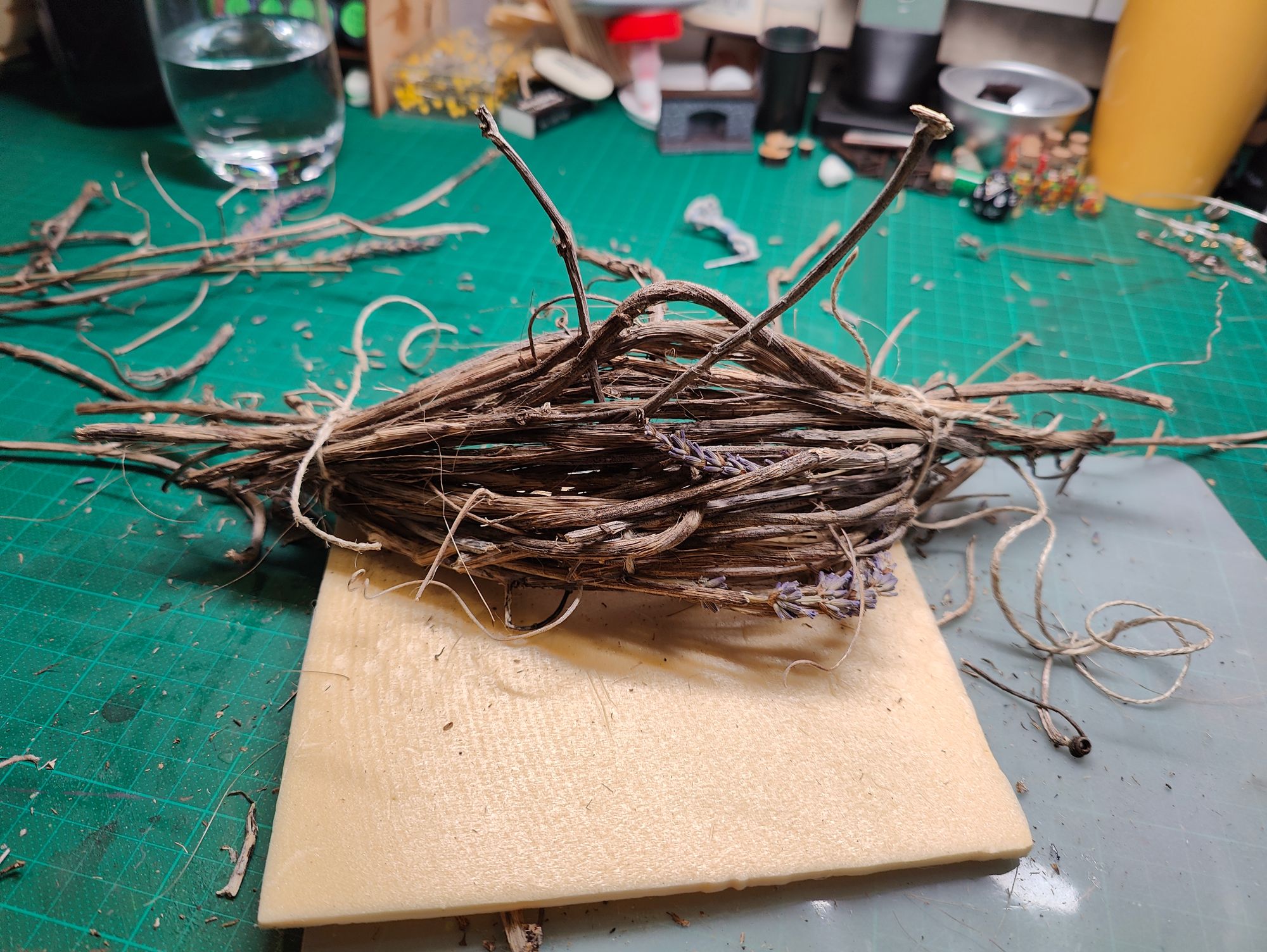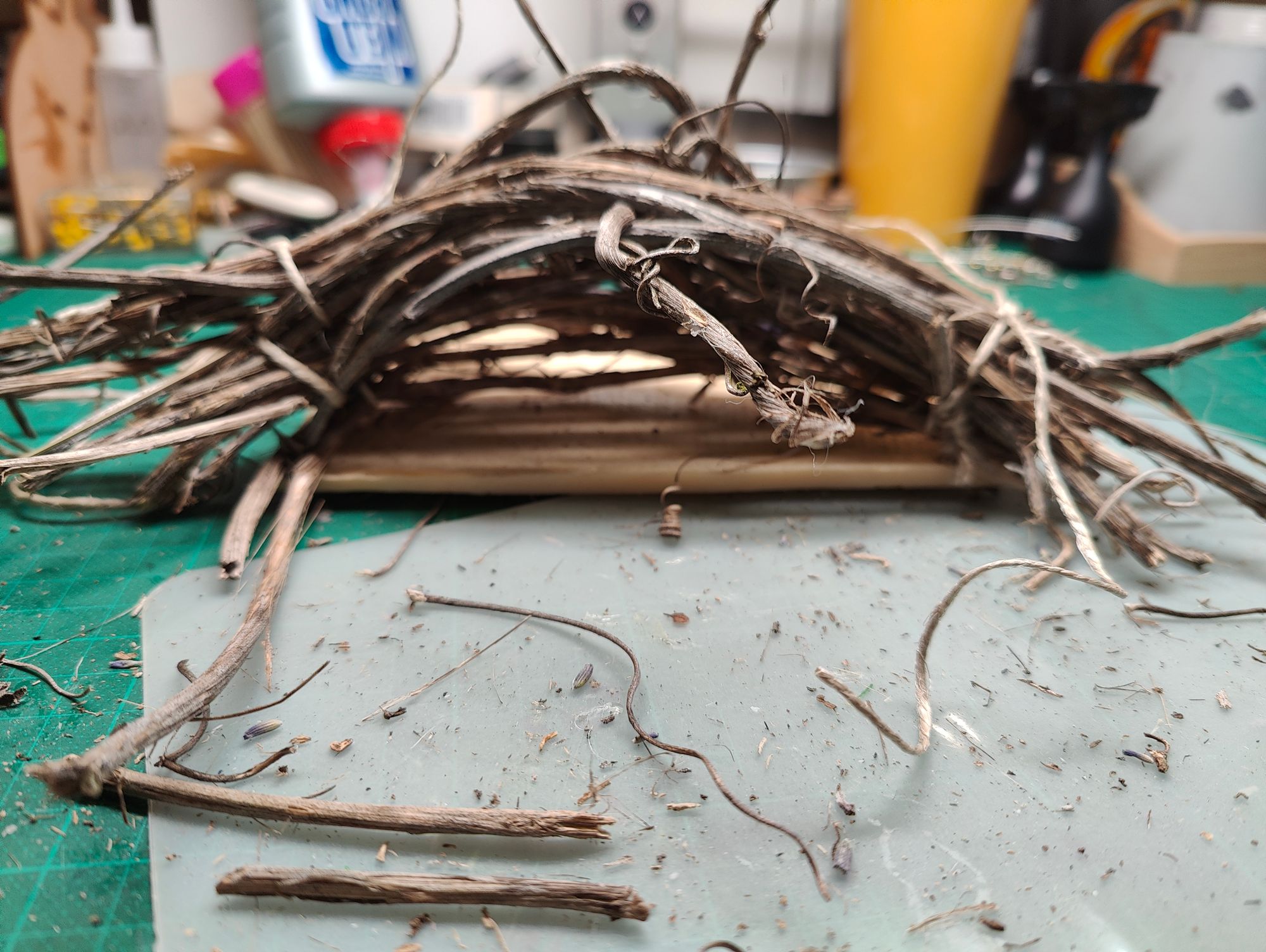 Initially I formed a semicircle with one branch and glued it into some XPS foam with hot glue for the beginning anchor structure. I wound more branches into a structure based around the first curve and just kept adding to this. Eventually to hold it together I needed to use some jute string on each ‘corner’ where it attached to the foam.