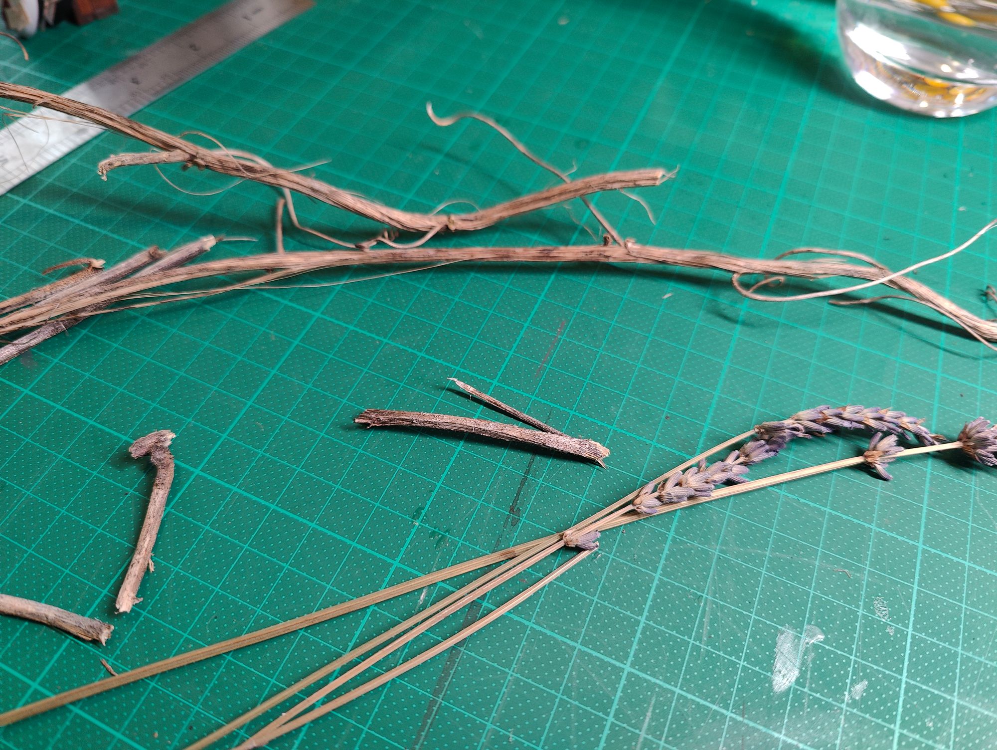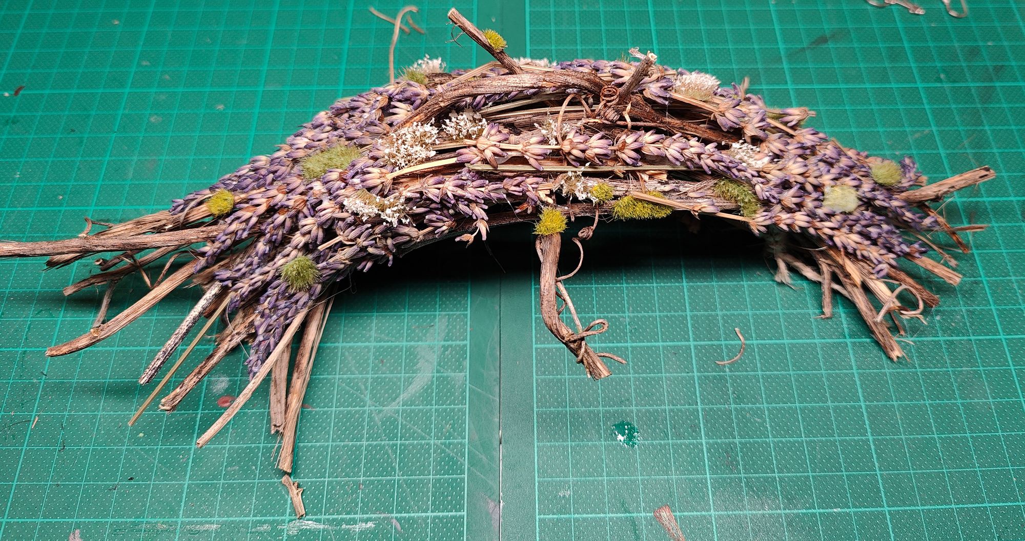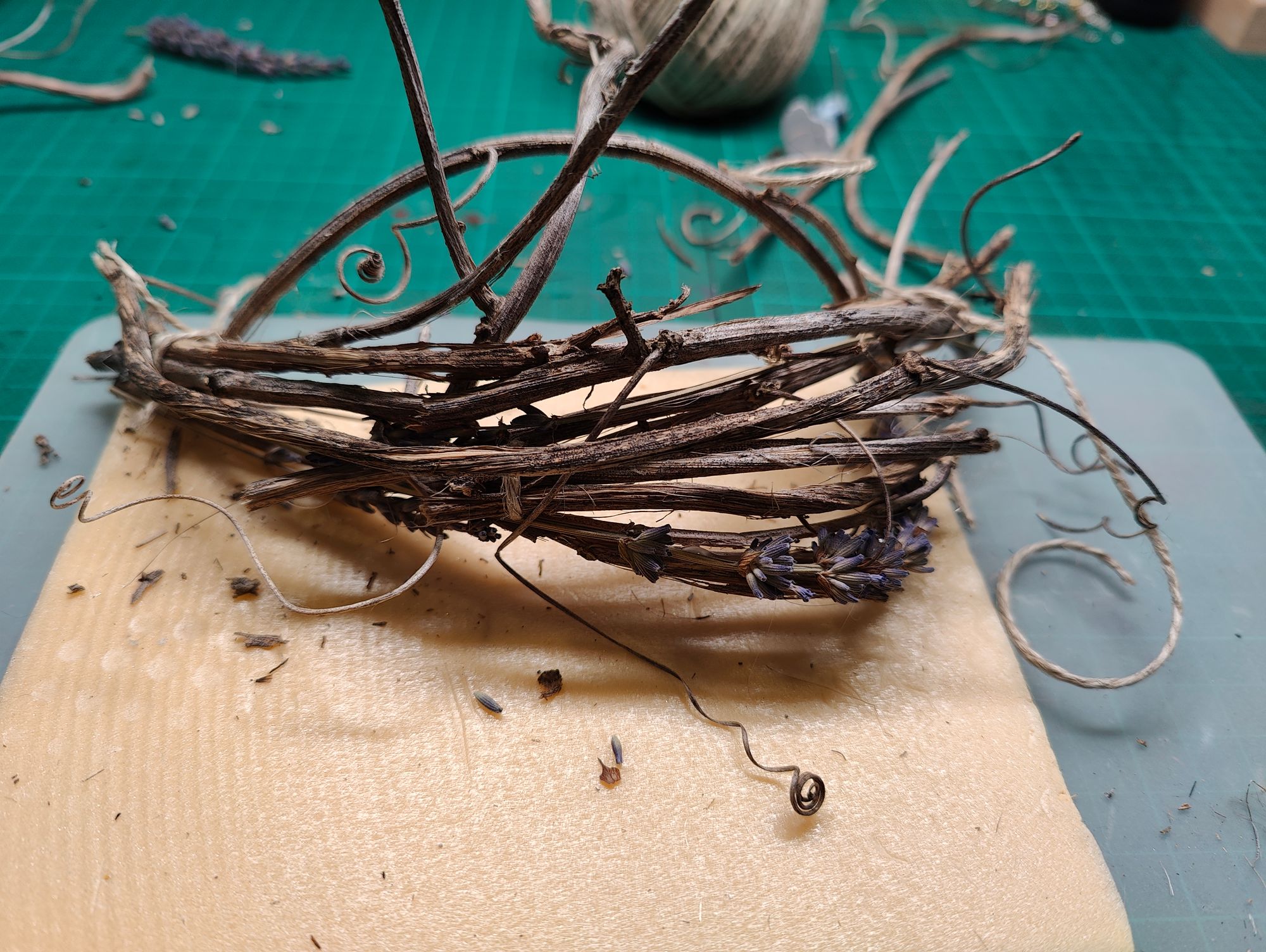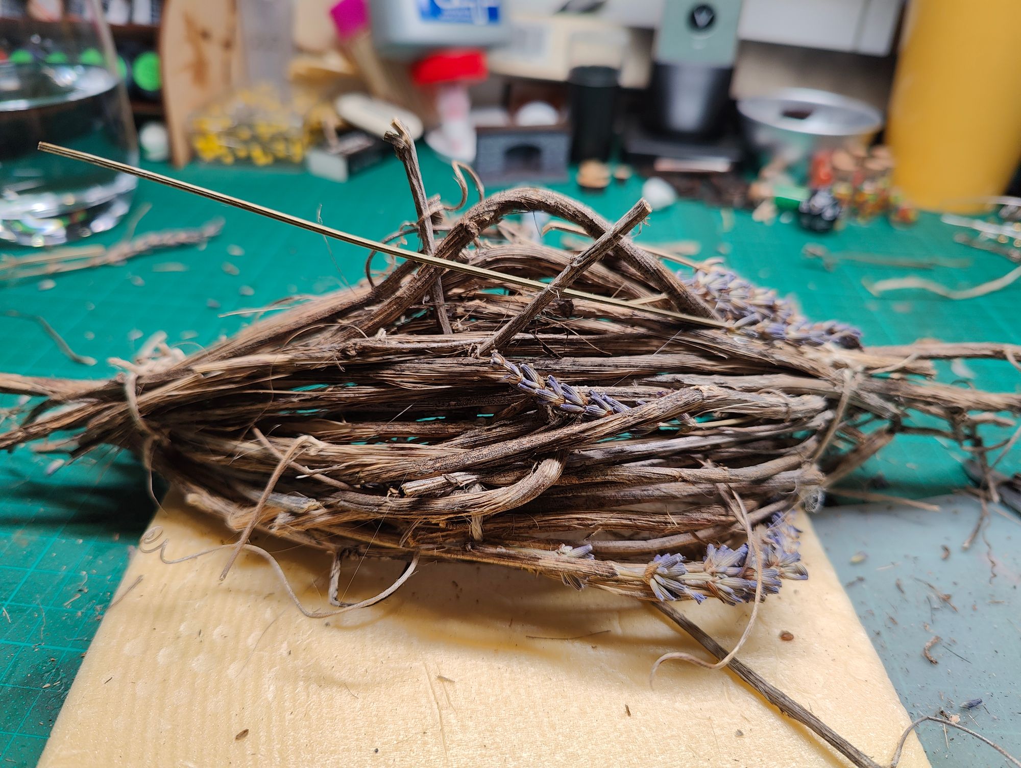 Once the structure was forming i started to weave in stems of lavender which added to the form and built the shape. Once the sticks had been added I worked at covering the two corners of jute with lavender, almost like a thatched roof.