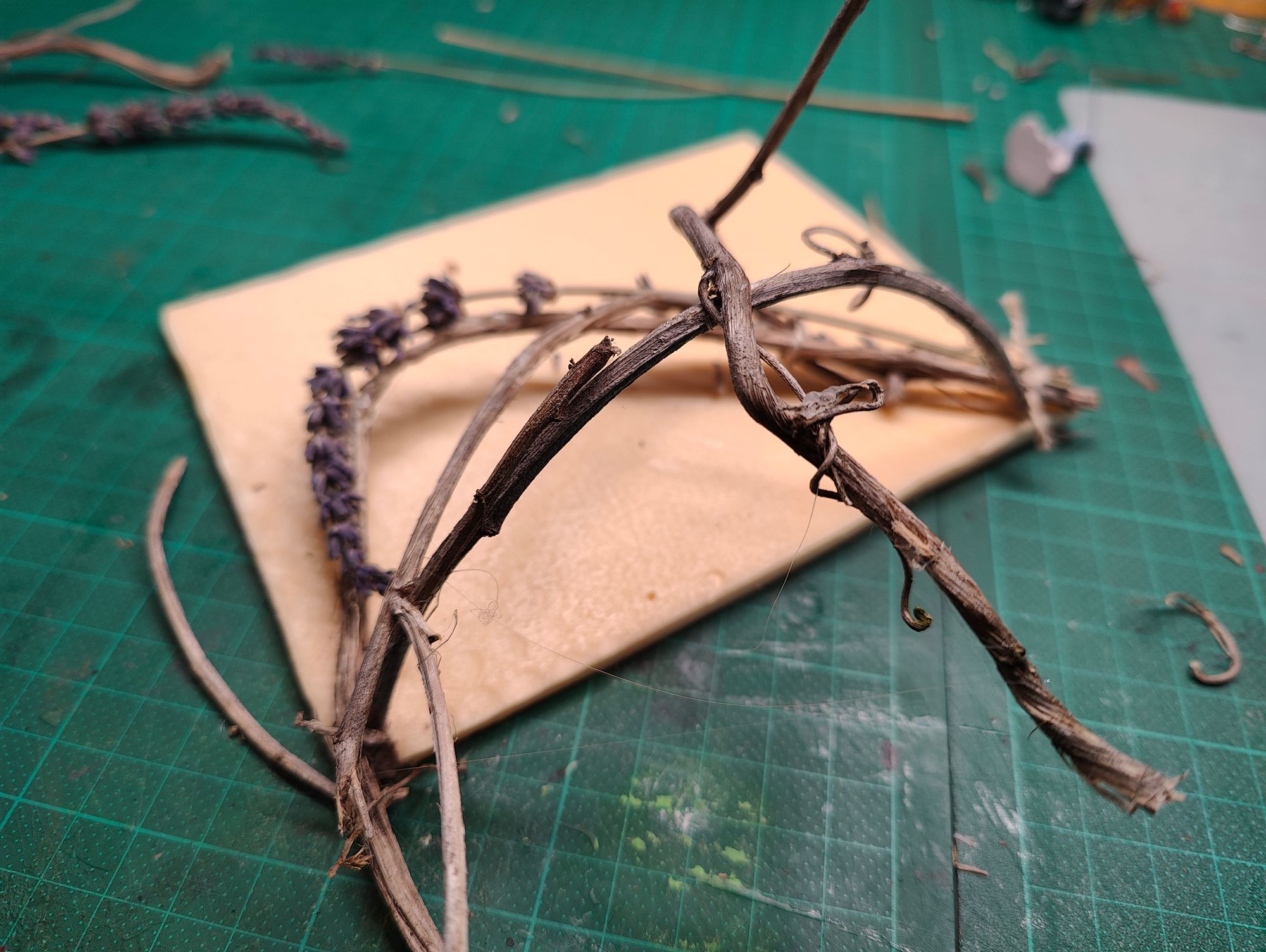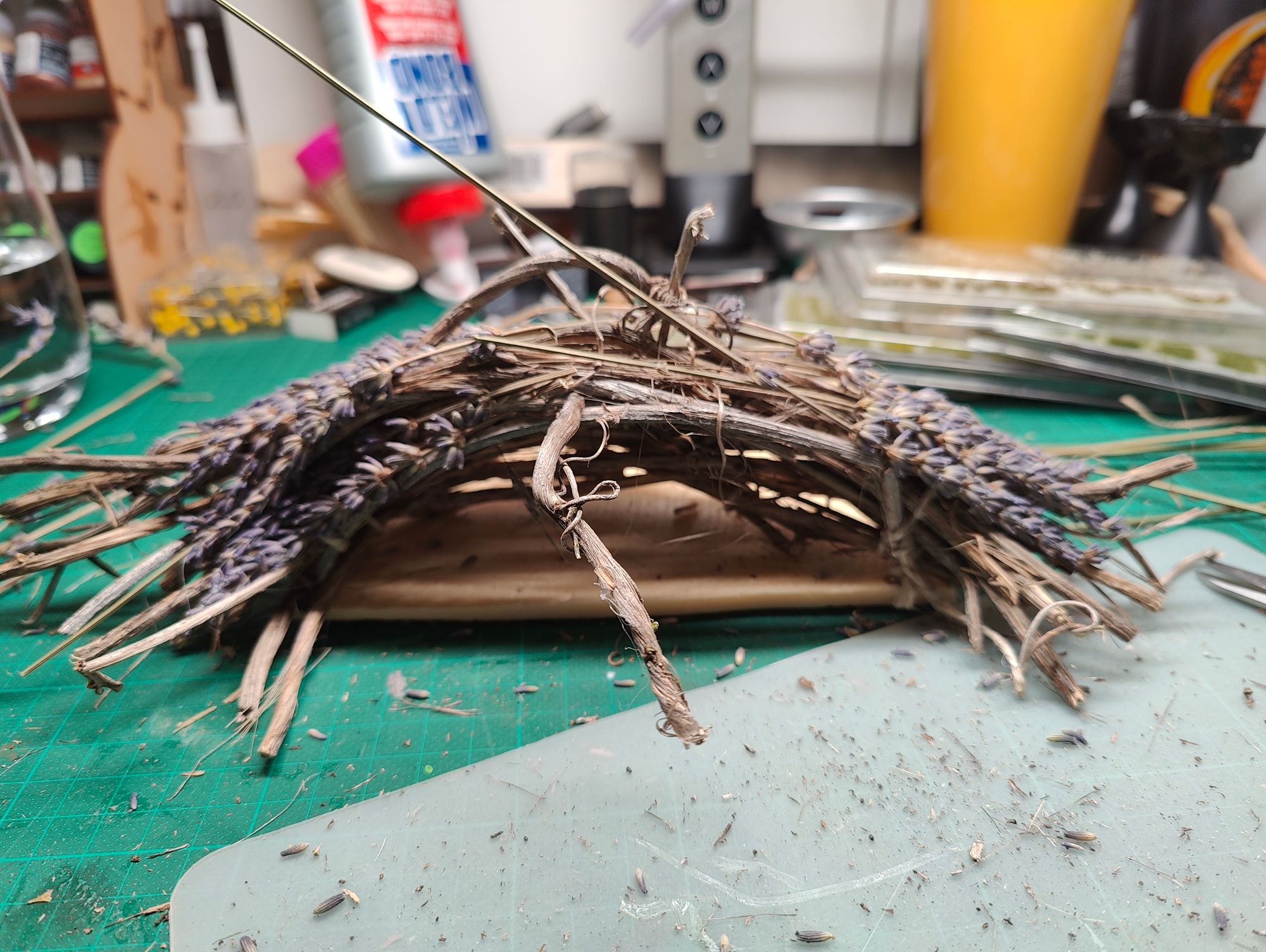 I also had a bunch of dried lavender in the kitchen and thought this would look reasonable when added in for bulk, texture and colour. I wanted a curved structure like a cave mouth and just high enough for a 28mm mini to stand in.