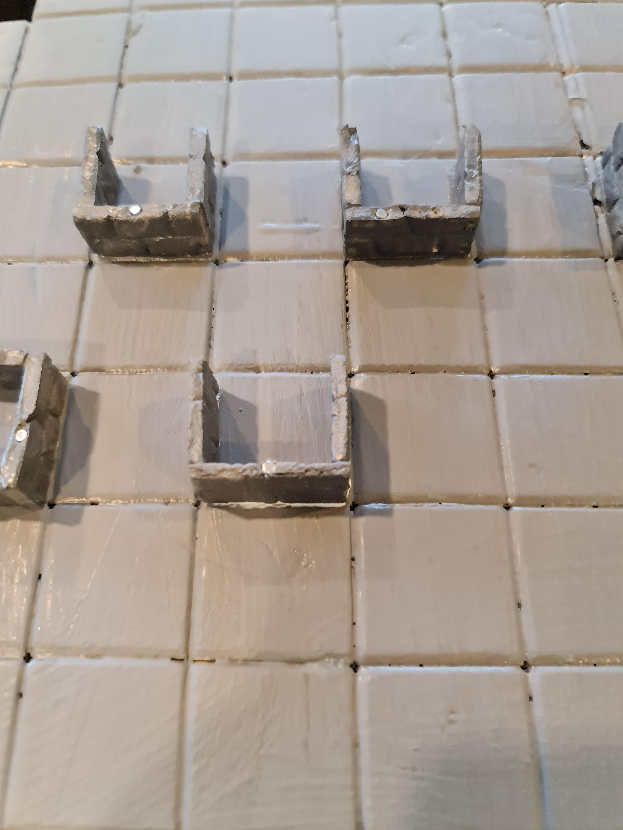 I am now quite a way through but it has been a hard slog, I have only crafted the floor layout of the individual rooms, base coated with mod podge and for some i have also added the base layer. This evening I finished a coat of stone grey on the floor of the dungeon and started questioning my life choices. This was after crafting the three half height walls of each of the 32 crypts. Each set of three walls is held together by two nails, glued down to the base board and held there by a third nail. The baseboard has been drawn out and grey mod-podged. Each set of three walls has been carved out with a pencil and grey mod-podged. This evening I joined them all together and painted a grey layer over all. It was tedious, very tedious. I have to keep reminding myself that tedium comes before interesting.